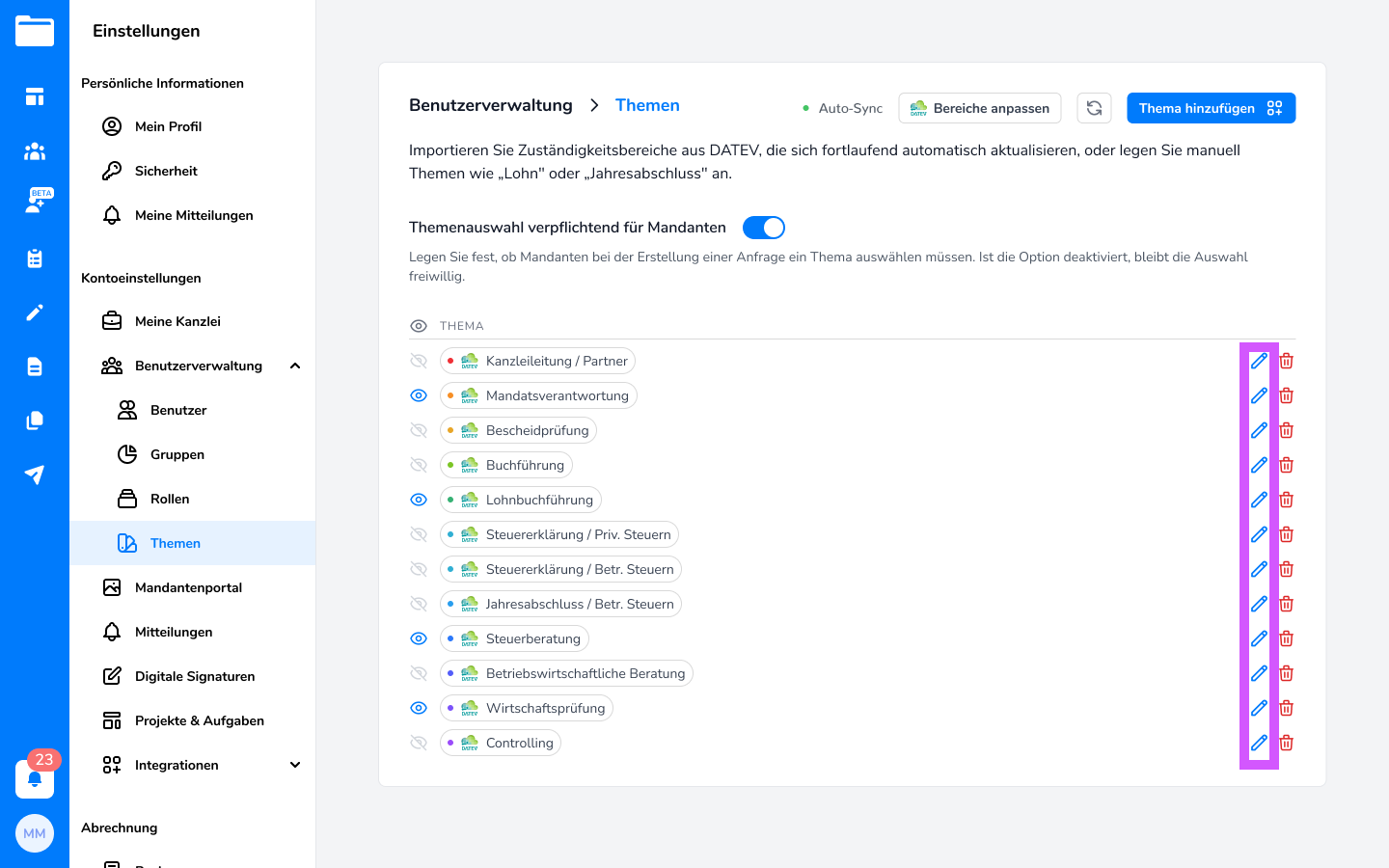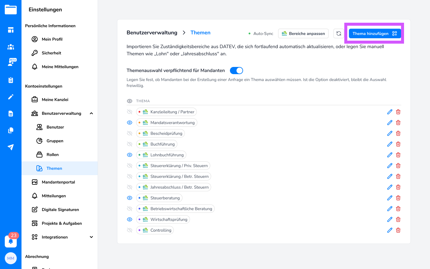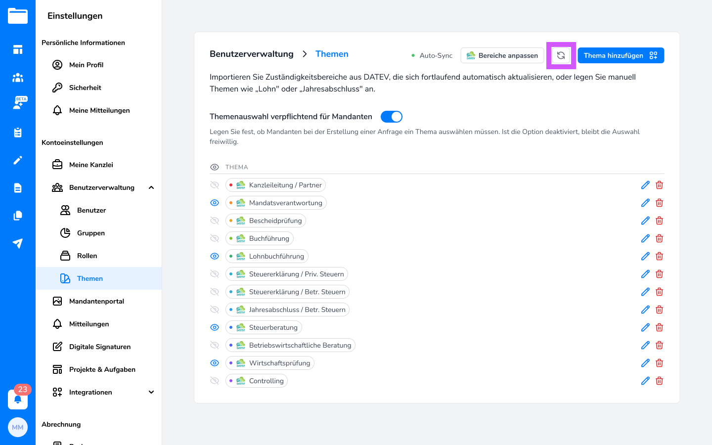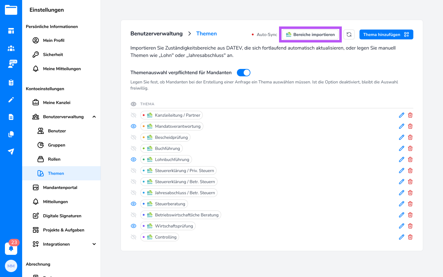 Sie können Zuständigkeitsbereiche direkt aus DATEV importieren. Um Themen zu importieren, rufen Sie in der Benutzerverwaltung, den Menüpunkt Themen auf.