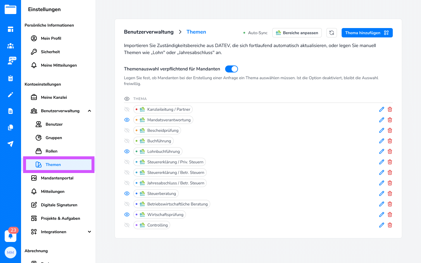 Die Themenauswahl steuert die Benachrichtigungen innerhalb der Kanzlei. Wenn ein Mandant eine Anfrage mit einem bestimmten Zuständigkeitsbereich erstellt, werden nur die Mitarbeitenden benachrichtigt, die für diesen Bereich zuständig sind.