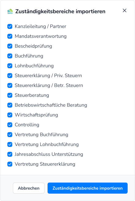 Wählen Sie anschließend die gewünschten Zuständigkeitsbereiche aus der Liste aus und bestätigen Sie den Import. Importierte Zuständigkeitsbereiche werden mit einem DATEV-Symbol gekennzeichnet.