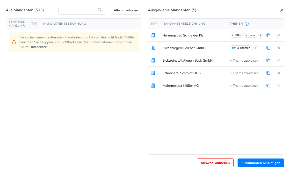 Schritt 5: Themen auf mehrere Mandanten übertragen (optional, nur wenn Sie nicht die Zuständigkeiten aus DATEV nutzen)